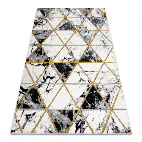Elegáns márvány mintás szőnyeg, fekete-arany háromszögekkel - 160x220 cm Ez a gyönyörű szőnyeg modern és elegáns megjelenést kölcsönöz otthonának. A márványhatású mintázat és a fekete-arany háromszögek kombinációja luxus érzetet kelt. A 160x220 cm-e...
