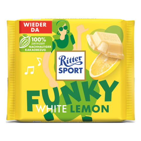 Ritter Sport 100 g White Lemon fehércsokoládé Ez a Ritter Sport White Lemon 100 g-os tábla egy különleges citrusos élmény, amely a krémes fehér csokoládé és a friss citromos íz harmóniáját kínálja. Ideális társ a napsütéses napokra, vagy egy kényezte