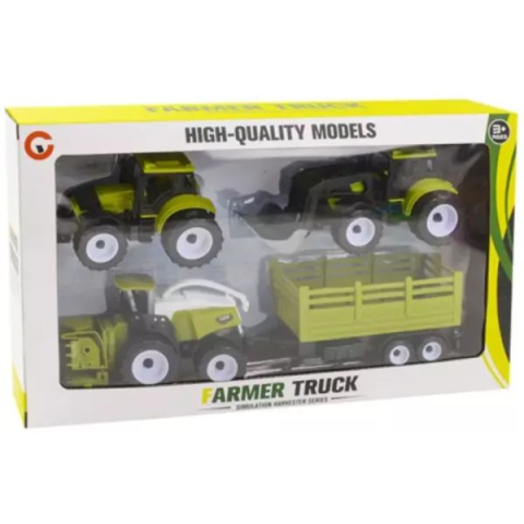 Kiváló minőségű mezőgazdasági jármű modell.A termék jellemzői:Lendkerekes működésRészletes kialakítás a valósághű megjelenés érdekébenTartós műanyagból készült3 különféle jármű és egy utánfutóBeltéri és kültéri játékra egyaránt alkalmasCsomagolás mérete: 22.5 x 39 x 7 cm