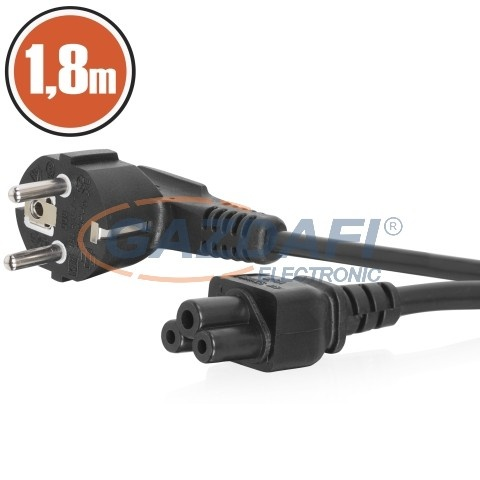 Hálózati tápkábel notebook-hoz 1,8 m Csatlakozók típusa: IEC C5 aljzat - 90º-os CEE 7/7 dugó Max. terhelhetőség: 16A/250V Belső erek: 3x0,75mm² Szigetelés: Dupla Szín: Fekete Hossz: 1,8 m