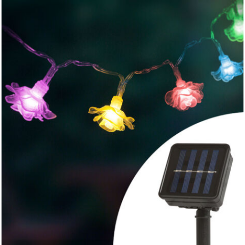 Nemcsak karácsonykor, az év bármely napján kiválóan hasznáható dekor fényfüzér. Az átlátszó kis virágokat színes LED-ek világítják meg, ezzel teremtve kellemes hangulatot hazaérkezéskor. A nap folyamán a szolár panel a napfényt elektromos árammá alakítja és feltölti a beépített akkumulátort. Szürkületkor a termék automatikusan bekapcsol, napfelkeltekor pedig ki. Idális lehet bármilyen kertben, bokrok, fák, virágoskertek egyedi és különleges dekorálásá