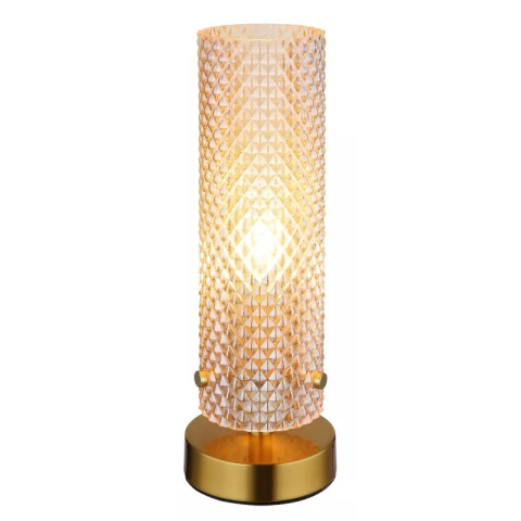 Asztali lámpa, fém aranyszínű, borostyán színű üveg, kábel PVC fekete, billenőkapcsoló a kábelen, ø: 100mm, M: 285mm, kábel hossza 1500mm, 1x E14 40W 230V izzó nélkül