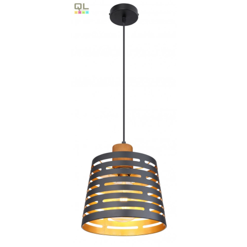 Függeszték fém fekete alaplap, fekete kábel, fém fekete - arany búrák, natúr fa betéttel kombinálva. Magasság: 1200 mm, 1 x E27, 60 W, 230 V.