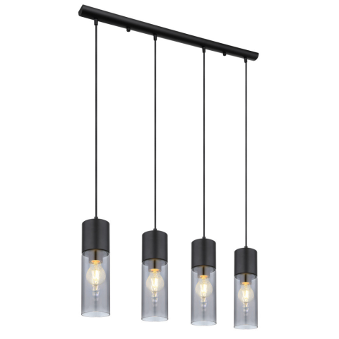 Matt fekete fém függeszték füstszínű üvegbúrával és fekete textil kábellel. 4 db E27-es foglalattal. Fényforrást nem tartalmaz.