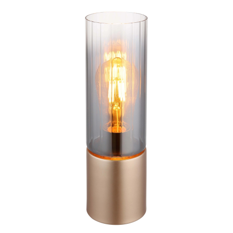 Asztali lámpa, fém cappuccino matt, füstszínű/átlátszó színátmenetes barázdált üveg, fehér textil kábel, érintésre ki/be kapcsolás.