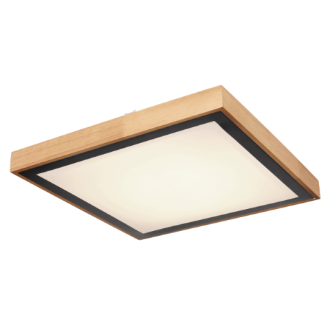 Mennyezeti lámpa, matt fekete fém, barna fa, akril opál, lépcsős kapcsoló, 3000-4500-6000K kapcsoló a terméken, HxSzxM: 390x390x90mm, inkl.LED 24W 230V, 1020lm, CCT 3000/4500/6000K