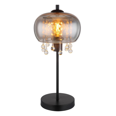 A Corry Globo 15839T üvegcseppes asztali lámpa elegáns, 45 cm magas kialakítással rendelkezik, amelyet kristály láncok és üveg díszítés tesz különlegessé. A lámpatest matt fekete és füstszínű árnyalatban készül, anyaga fém és üveg kristály. Egy darab E27