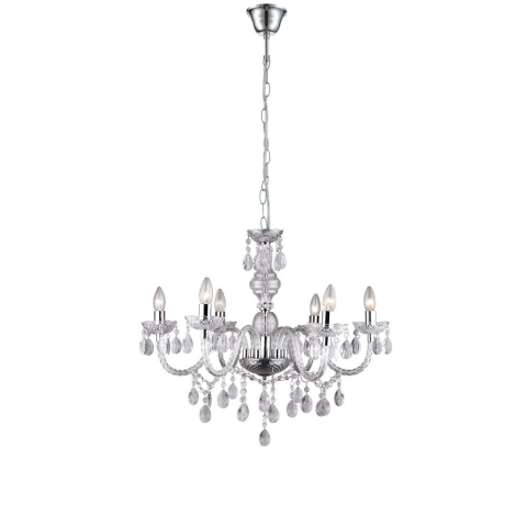 A Klasszikus kristály csillár, 6 karos - Cuimbra Globo 63116-6 egy elegáns, függesztett lámpatest, amelyet a Globo gyárt. A csillár váza fém, díszítése áttetsző akril kristályból készült, króm színű felülettel. Hat darab E14 foglalattal rendelkezik, amely