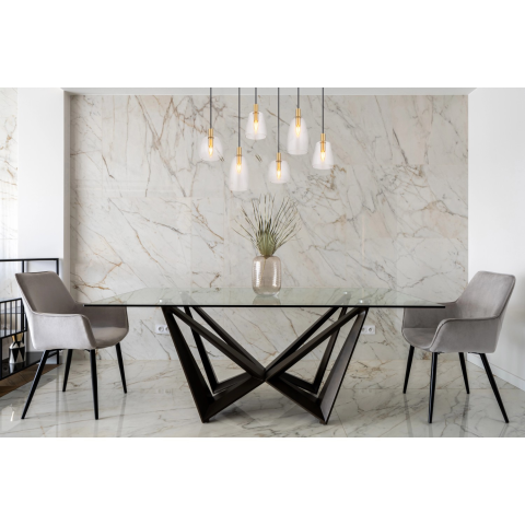 Ez a gyönyörű függőlámpa lenyűgöz nagyszerű kialakításával, és a helyiségek középpontja lesz. Az aranyszínű mennyezeti tartóból hat fekete, legfeljebb 1,3 m hosszú kábel vezet egy-egy E14-es foglalathoz, amelyeket gyönyörű, különböző formájú, átlátszó üvegbúra borít. Az E14 foglalatok lehetővé teszik, hogy tetszés szerint határozza meg a fény színét és erősségét 40 wattos maximális teljesítményig. Teremtsen hangsúlyokat.