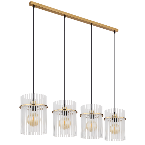 A GORLEY függőlámpa elegáns és modern világítási megoldás otthona számára. Az egyenes gerendáról négy függeszték lóg le, amelyek stílusos megjelenést és kellemes megvilágítást biztosítanak. Aranyszínű, matt fémtestének köszönhetően fényűző megjelenést kelt, és tökéletesen illeszkedik a modern lakberendezési stílusokhoz. A búrák művészien elrendezett, fehér és átlátszó színátmenetes üvegpálcákból állnak, amelyek lenyűgöző fényjátékot