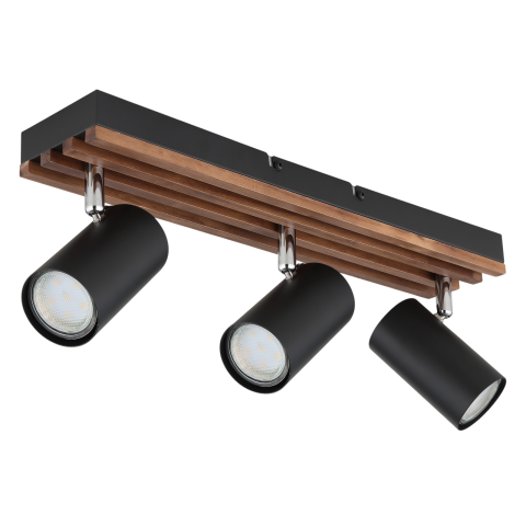 A GLOBO 57909-3 KAYDEN mennyezeti spotlámpa kialakításánál ötvöztük a modern és a természetes dizájnt. A téglalap alakú fali tábla elegáns, sötétbarna fa hatású felülettel lett ellátva, amely tökéletesen harmonizál a fekete, matt fém testtel. A szintén matt fémből készült hengeres spotlámpák rugalmasan állíthatóak, és lehetővé teszik a fény irányítását a célzott megvilágításhoz. 410 mm hosszú, 80 mm széles és 125 mm magasságú lámpa tökéletes