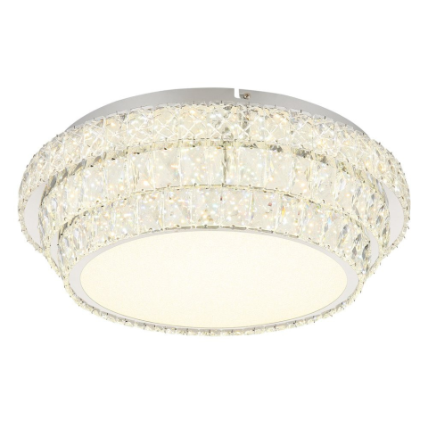 A Klara Globo 68157-48 távirányítós mennyezeti LED lámpa 50 cm-es átmérővel, K5 kristály berakással és króm-áttetsző kivitelben készült. A lámpatest 48 W teljesítményű integrált LED modullal rendelkezik, amely 3400 lumen fényáramot biztosít, valamint fény