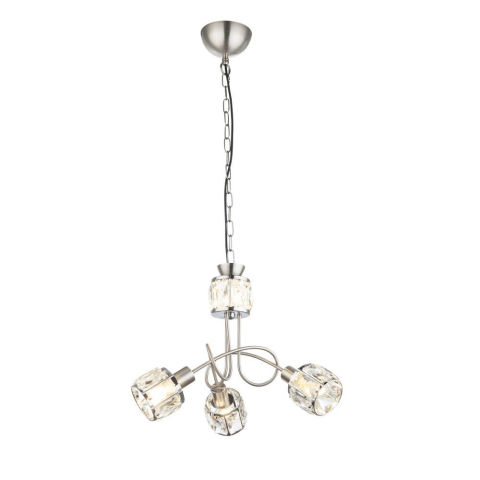 A Kris Globo 54356-3H modern karos kristály csillár három E14 foglalattal rendelkezik, melyekben cserélhető fényforrások helyezhetők el. A lámpatest króm és üveg anyagok kombinációjával készül, áttetsző és ezüst színben. A csillár átmérője 380 mm, maximál