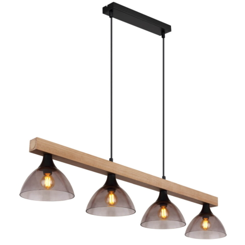 Modern függeszték matt fekete és natúr fa színkombinációval, füstszínű üveggel. A függeszték magassága rövidíthető. A fényforrás nem tartozék.
