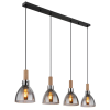 Modern függeszték matt fekete színben, füstszínű, 16 cm-es üvegbúrákkal, fahatású dekorral. A függeszték magassága rövidíthető. A fényforrás nem tartozék.