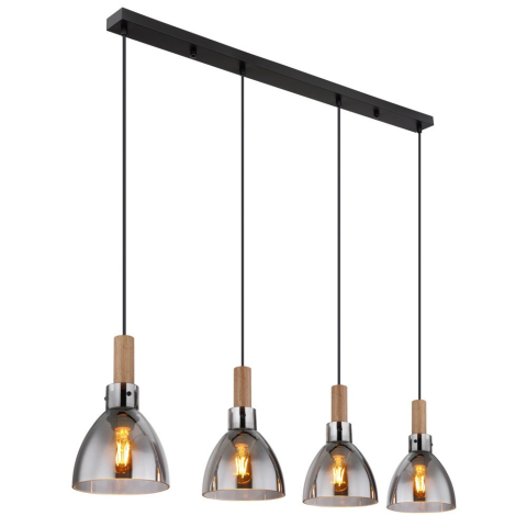 A Mattea Globo 15550-4H függesztett lámpa modern lakásvilágítási megoldás, amely fa hatású és füstszínű kivitelével egyedi megjelenést biztosít. A lámpatest fő anyaga üveg és fém, matt fekete, valamint füstszínű árnyalatokkal. Négy darab E27 foglalattal r