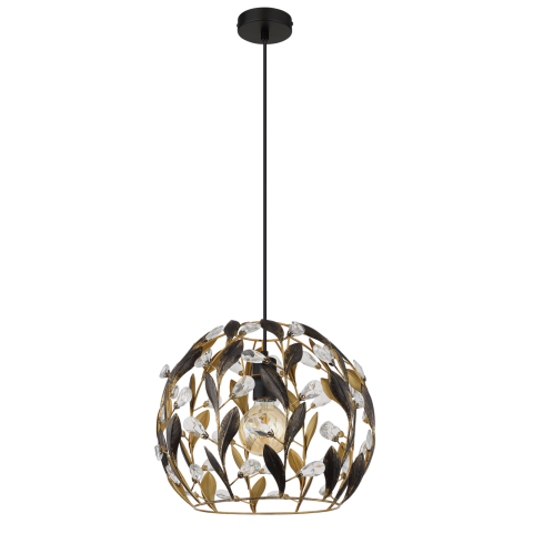 A GLOBO 15759H MIKA függőlámpa eleganciát kölcsönöz bármely helyiségnek. A fekete matt fémből készült test modern, időtlen megjelenést nyújt. A búrája arany színű, patinás fémből készült, amelyet fekete levél formájú elemek és csillogó kristályok díszítenek. Ez a kombináció varázslatos fényjátékot hoz létre, amely meleg, hívogató fényben fürdeti szobáját. A függőlámpa E27-es foglalattal lett felszerelve, amelybe az izzót Ön választhatja meg az