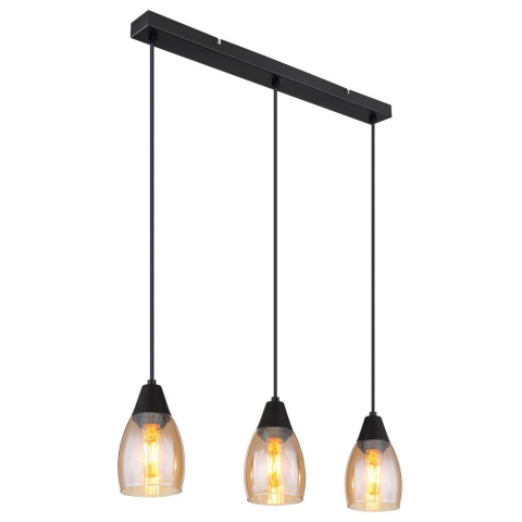 A Reid Globo 15705-3H függesztett lámpa borostyán színű üveg búrával és matt fekete fém vázzal rendelkezik. A lámpatest három darab E27 foglalattal szerelt, amelyekbe cserélhető fényforrások helyezhetők, így a fényáram, fényszín, teljesítmény és színhőmér