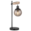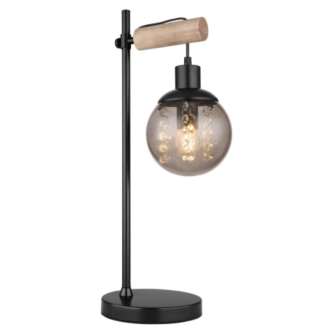 Vintage asztali lámpa matt fekete és natúr fa színben, füstszínű üveggel, benne átlátszó műanyag kristályokkal. A lámpa a vezetéken található billenőkapcsolóval kapcsolható. A fényforrás nem tartozék.