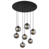 A Riha Globo 56133-7H füstszínű függesztett lámpa modern lakásvilágítási megoldás, amelyet hét darab üveggöm búra és matt fekete fém szerkezet jellemez. A lámpatest 7 db G9 foglalattal rendelkezik, amelyekhez cserélhető fényforrások tartoznak, így a fényá