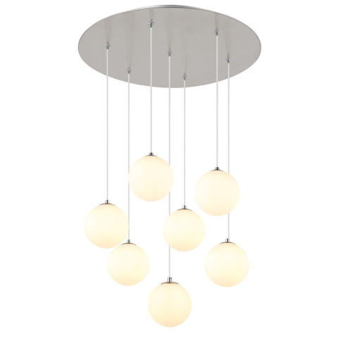 A Riha Globo 56140-7H üveggömbös függesztett lámpa modern lakásvilágítási megoldást kínál, amely hét darab G9 foglalattal rendelkezik, így cserélhető fényforrással üzemeltethető. A lámpatest opál színű üveggömbjei és nikkel színű fém szerkezete esztétikus