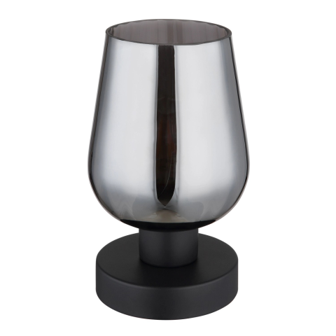 Asztali lámpa fém fekete matt, füstszínű üveg, fekete PVC kábel, billenőkapcsoló a kábelen, átmérő: 135mm, M: 220mm, kábel hossza 1500mm, 1x E27 40W 230V izzó nélkül