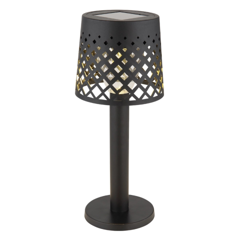 Globo napelemes asztali lámpa. Színe fekete csipke hatású bBúrával.Anyaga műanyag.