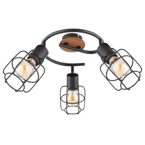 Mennyezeti lámpa 25 cm átmérővel. Barna fa dekorral és fekete fém rács búrákkal. 3xE27 fogalattal, max. 40W. A fényforrás nem tartozéka alámpának, így igényünknek megfelelő fényforrást választhatunk.