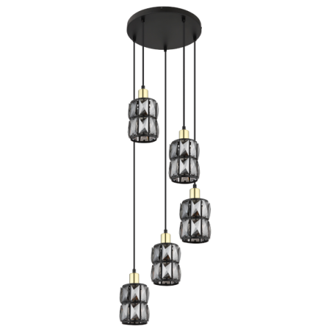Függeszték, matt fekete fém, füstszínű üvegkristályok, sárgaréz színű matt fém, fekete PVC kábel, ø: 300mm, M: 1200mm, exkl. 5x E14 40W 230V