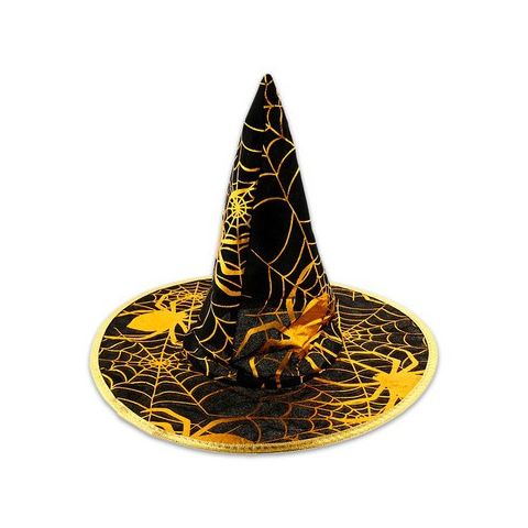 Legyél te a legfélelmetesebb boszorkány a Halloween napján és egészítsd ki jelmezedet ezzel a boszorkány kalappal. A sötét alapon aranyozott minták a pókhálós mintával igazi kísértetes hangulatat varázsolnak. Garantáltan lélegzetelállító leszel Halloween estéjén! A kalap magassága: 34 cm, átmérője: 38 cm.