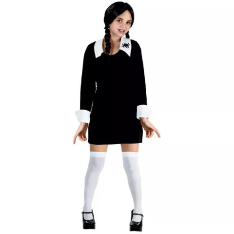 Gót iskoláslány jelmez beöltözős bulikra!Ezzel a fekete-fehér színű, gót iskoláslány jelmezzel kicsik és nagyok rémesen különlegesen jelenhetnek meg a beöltözős bulin, akár Wednesday. A ruha gallérral és pókkal díszített; elegáns, ugyanakkor borzasztóan rejtélyes megjelenést kölcsönöz a viselőjének. A jelmez jó választás farsangi mulatságra, Halloweenre, beöltözős buliba, de akár a szerepjátékok kiegészítője is lehet.A képen látható cipő, harisn
