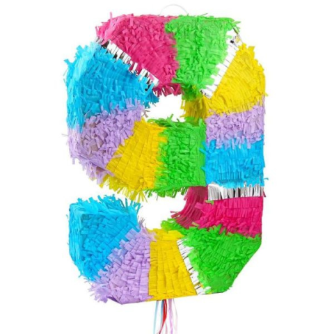 9-es szám formájú pinata születésnapi bulikhoz, évfordulókhoz. Csak meg kell tölteni cukorkákkal, felakasztani egy kampóra, szögre vagy faágra, majd egy bottal vagy seprűnyéllel addig ütögetni, amíg a papírmasé megadja magát, és az édességek a földre potyognak.A játék használata felnőtt felügyelete mellett ajánlott. A pinata maximum 1 kg cukorkával tölthető meg.A csomag cukorkákat nem tartalmaz.Anyaga: papírMérete: 35 x 7,5 x 50 cmA piñata (ejtsd pinyáta) eg