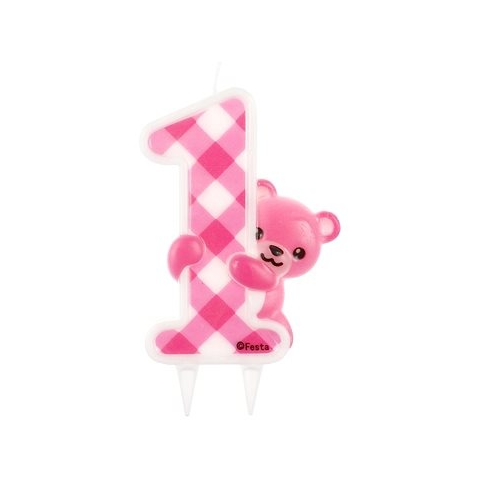 1 kép Godan Születésnapi gyertya, 12cm, mackó, "1", rózsaszín, rózsaszín