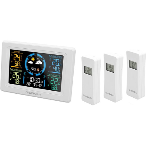 Időjárás állomás - otthoni, vezeték nélküli, rádióvezérelt csatlakozás, beltéri használatra, előrejelzéssel és valós idejű időjáráskövetéssel, ébresztőóra, DCF vétel és max. és min. érték memória, mért értékek: légnyomás, hőmérséklet, páratartalom, idő, dátum és holdállás megjelenítése, vezeték nélküli érzékelő hatótávja 70 m, maximum 3 vezeték nélküli érzékelő csatlakoztatható, önállóan használható, hálózatról és elemmel i