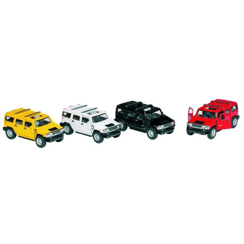 Die-cast fém lendkerekes játék autó HUMMER H2 SUV 2008 négy színben, nyitható ajtókkal 1:40 méretarányban. Anyaga: fém Méret: 12,5 cm Az ár egy db-ra vonatkozik.