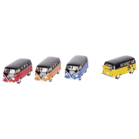 Die-cast fém lendkerekes játék VW busz 1962 négy színben, nyitható ajtókkal 1:32 méretarányban. Anyaga: fém, műanyag Méret: 13,5 cm Az ár egy db-ra vonatkozik.