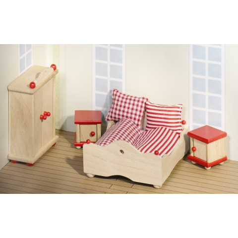 Goki fa babaház bútor, hálószoba 4 részes. A német Goki fajáték márka egyaránt kedvelt mind a gyerekek, mind a gyerekekkel foglalkozó óvodák és egyéb intézmények körében, a Goki játékok kidolgozottsága, színvilága és minősége saját véleményünk szerint is