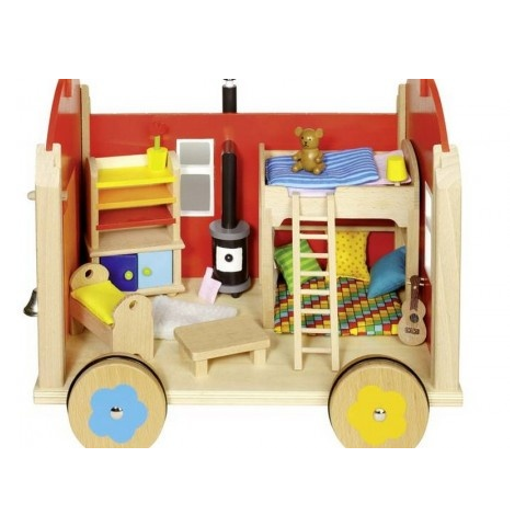 Goki fa babaház, lakóautó 23 db-os készlet bútorozva, babák nélkül. A játék a fényképen szereplő fa babaház bútorokat tartalmazza, fa babákat külön kell választanod hozzá. A német Goki fajáték márka egyaránt kedvelt mind a gyerekek, mind a gyerekekkel fog