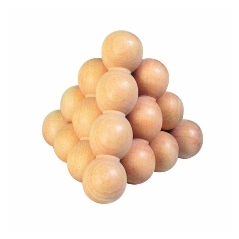 Fa logikai kirakó, golyópiramis A golyópiramis fa logikai kirakó 6 db eltérő hosszúságú, 1-4 golyót tartalmazó kirakó elemből áll. A fa logikai kirakó elemek helyes kombinációjából állítható össze a képen látható golyópiramis. Talán a legnehezebb felad