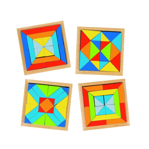 Fa puzzle és fa építőkocka, mozaik, 4 db-os készlet, típusonként 20-25 db építőkockával. Fa építőjáték két funkcióval: a keretben használva fa puzzle, az elemeket a keretből kivéve fa építőkocka. Anyaga: fa Méret: 16 x 16 x 2,1 cm