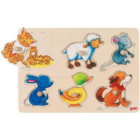 1 kép Goki Fogantyús Kirakó - Állatok És Kicsinyeik - 1 Éves Kortól, Fa, Többszínű (212484)