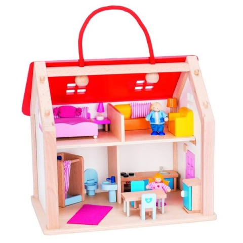 Goki hordozható fa babaház bútorozva babákkal. A német Goki fajáték márka egyaránt kedvelt mind a gyerekek, mind a gyerekekkel foglalkozó óvodák és egyéb intézmények körében, a Goki játékok kidolgozottsága, színvilága és minősége saját véleményünk szerint