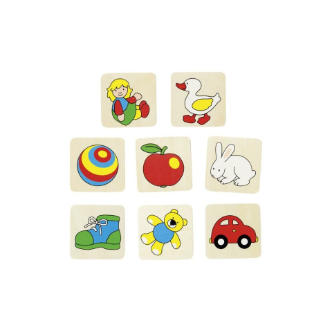 Erős, préselt fa lapokból készített, színes memória játék készlet 16 darab egyszerű, könnyen megnevezhető ábrákkal, 8 párral. A fa lapok nagy méretűek, kisgyermek kézzel könnyen felemelhetőek, forgathatóak. A játék kiterítve látv