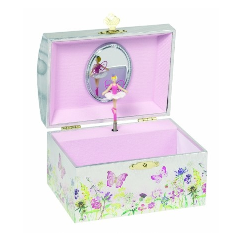 Zenélő ékszerdoboz forgó tündérlánnyal. Apró kincsek és ékszerek rejtekhelye ez a kedves, tündérrel díszített dobozka. A tető felnyitásakor táncol a balerina a felcsendülő Hattyúk tava zenére. A doboz erős, préselt kartonból készült, virágos mezőn pillang