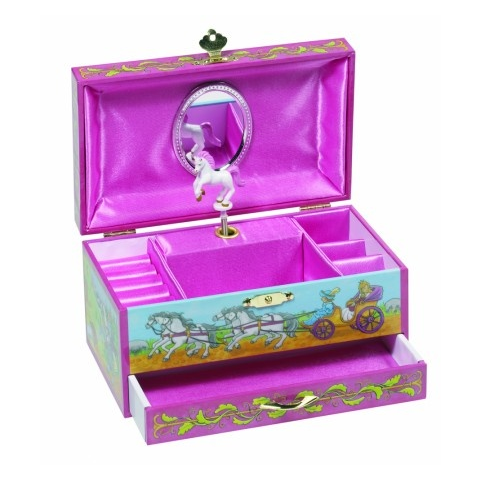 Lovas zenélő ékszerdoboz kihúzható fiókkal és külön tárolórekeszekkel a gyűrűk és apró ékszerek számára. A doboz erős, préselt kartonból készült, a tető felnyitásakor a Hattyúk tava zenéjére táncolni kezd a lovacska. A rózsaszín doboz oldalát és tetejét n