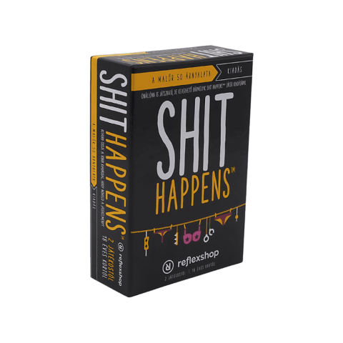 A Shit Happens egy izgalmas társasjáték tele humorral, meglepetéssel és őrülettel, akár csak a való élet. Minden kártya egy borzasztó eseményt rejt, rajta az elcseszett szituáció nevével, hozzá tartozó képpel és egy saját szarométer számmal. Vajon ezek a borzasztó események megtörténtek már veled? Á mindegy is, ha eddig nem, akkor ezután számíts ezekre is! A humorral fűszerezett Shit Happens erősen épít a sötét humorra és a kínos szituációk egyvelegére.