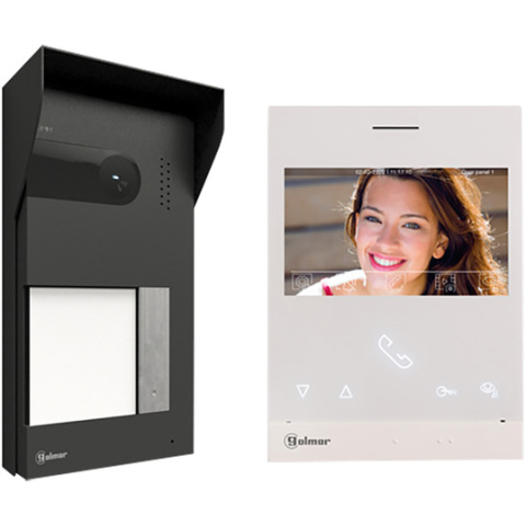 Golmar színes komplett kaputelefon szett A szett főbb jellemzői 4.3 hüvelykes kapacitív képernyő. Felületre szerelhető monitor. Jól hallható hangszórók. Hangkommunikáció, videó és titkos ajtónyitás. Video-spy funkciók, automatikus indítás, ne zavarjanak mód. Interkom funkció más beltéri egységekkel, külön-külön is. Választható csengőhangok. Csatlakoztatható külső nyomógomb a becsengetéshez. Kimenet kiegészítő hívásismétlő eszközö