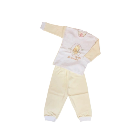2 részes hosszú ujjú pamut pizsama, mely megfelelő választás egy átlagos hőmérsékletű lakásba gyermekünk számára. Anyag: 100% pamut 30°fokon mosható Magyar termék
