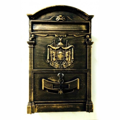 Alumínium öntvény előlappal ANTIKOLT színben. Készletről elérhető gyors szállítással. Befoglaló méretei: 260 mm x 410 mm Mélysége: 90 mm Levélnyílás mérete: 220 mm. Klasszikus dizájn: Reprezentatív címeres postaláda, amely kiválóan alkalmas a ház külső