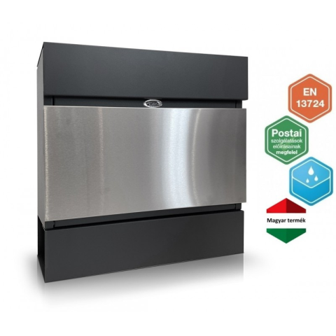 Falra vagy kerítésre szerelhető. Kültéri kivitel, felületkezelt, 0,5 mm vastag horganyzott lemezből. Felső bedobónyílással ellátott, nagy méretű küldemények fogadására fejlesztett levélszekrény, alsó szórólaptartóval. Az ajtó lefelé nyílik. Sorszámozott k